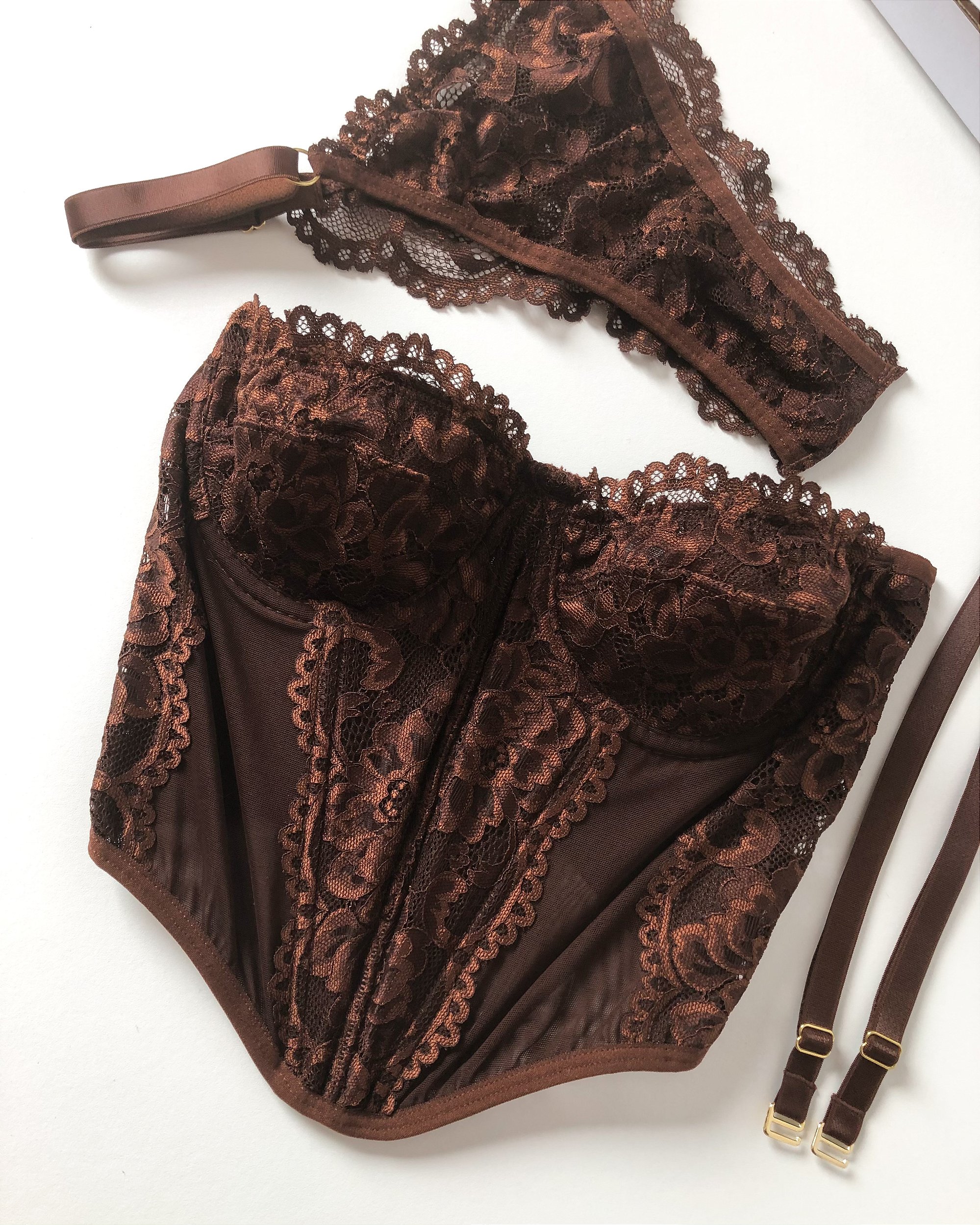 O Corset Verena é o modelo 2 em 1 perfeito para quem ama usar lingerie em looks. Composto por renda e tule liso, não possui bojo, tem aro meia-taça com forro em tule liso duplo em toda a taça. Conta com barbatanas frontais, alças removíveis e um lindo trançado nas costas com ilhoses para um ajuste perfeito. Todos os reguladores são banhados a ouro 24k.